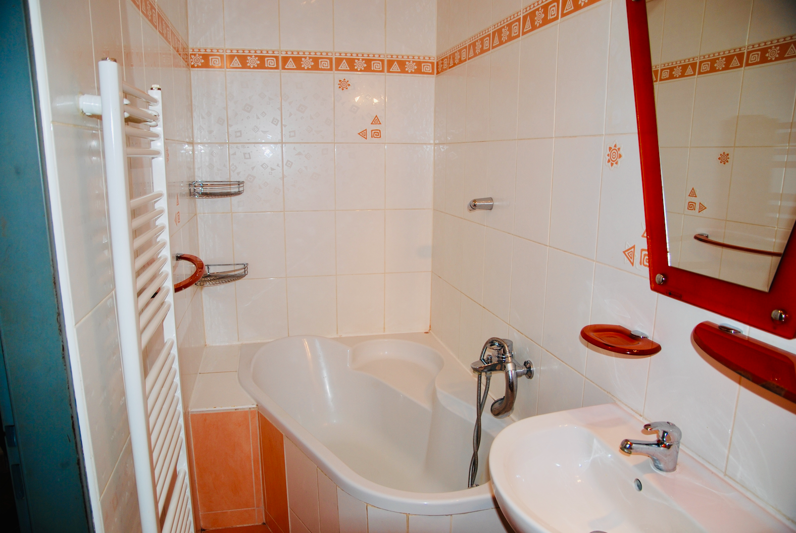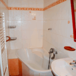 The bathroom offers a relaxing bathtub and essential amenities.
